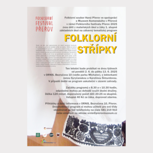 Dvouhodinový program s názvem Folklórní střípky si mohou učitelé pro své třídy objednávat už teď na ornis@prerovmuzeum.cz, nebo na tel. 581 219 910, kde se také dozví bližší informace. Mohou si vybrat začátek programu každý den v 8.30 nebo v 10.30, odpoledne mohou využít školní družiny. Program pro školy bude probíhat na zahradě ORNIS s lektorkami Janou Syryčanskou a Karolínou Šimurdovou, připravená je i verze pro případ špatného počasí.