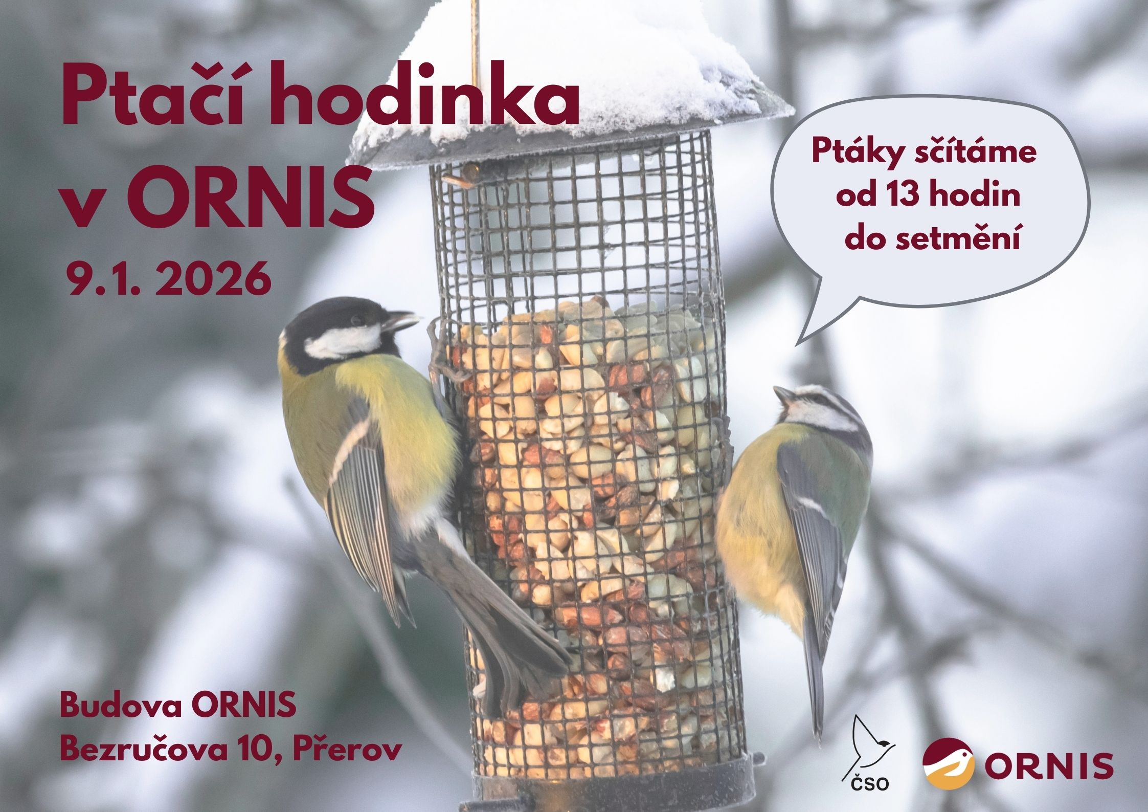 Zapojte se v pátek 9. 1. 2026 do Ptačí hodinky a přijďte si vyzkoušet zimní pozorování ptáků v ORNIS. Společně budeme sčítat ptáky na krmítku a zapojíme se tak do celorepublikové akce.